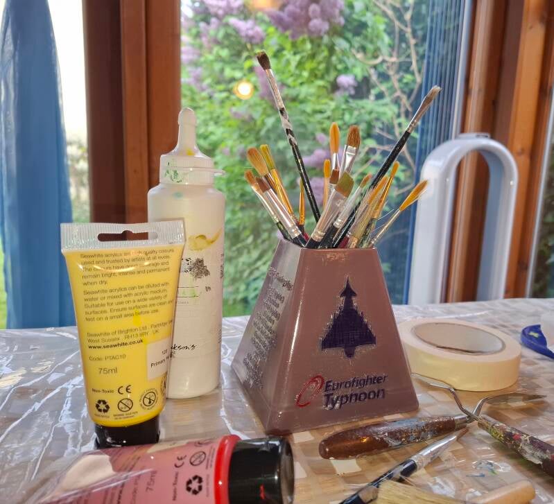 My friend Sophie made me a lovely brush holder with the Eurofighter Typhoon on it. I absolutely love it.