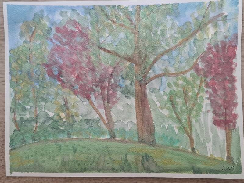 Just set up for art with this beautiful view from the Lodge of mature trees. There is a squirell walking towards my bird table. Seen so many birds 🐦 🐦‍⬛