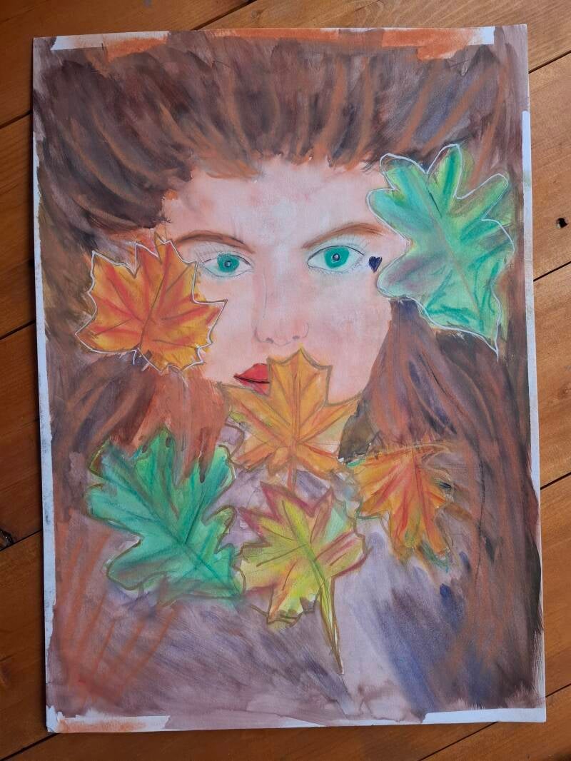 Autumn colours. November 2024 Watery Acrylic and soft pastel. Using autumn leaves to obscure a face and create a different composition. This was a real rush done in about 45 minutes in the class. Not reworked subsequently, but included as part of my journey. Will revisit this concept.